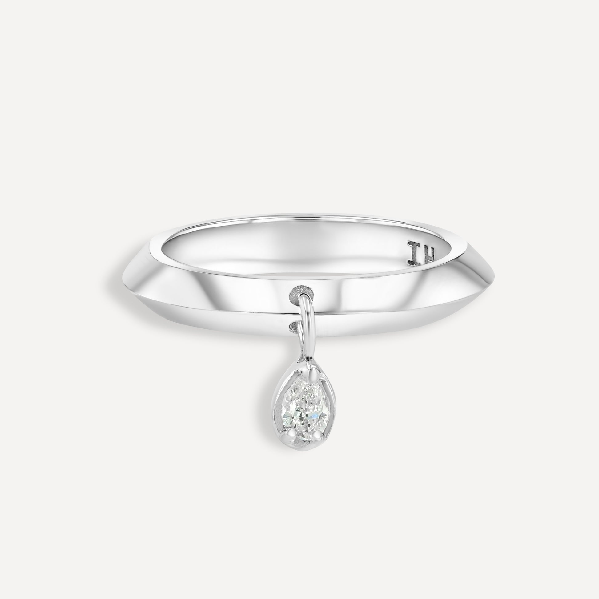 This ring pairs sharp minimalism with a soft, fluid sparkle. The diamond drop is designed to sway slightly, adding a subtle sense of movement that feels personal and expressive. Wear it alone as a modern statement or stack it to create your own story.