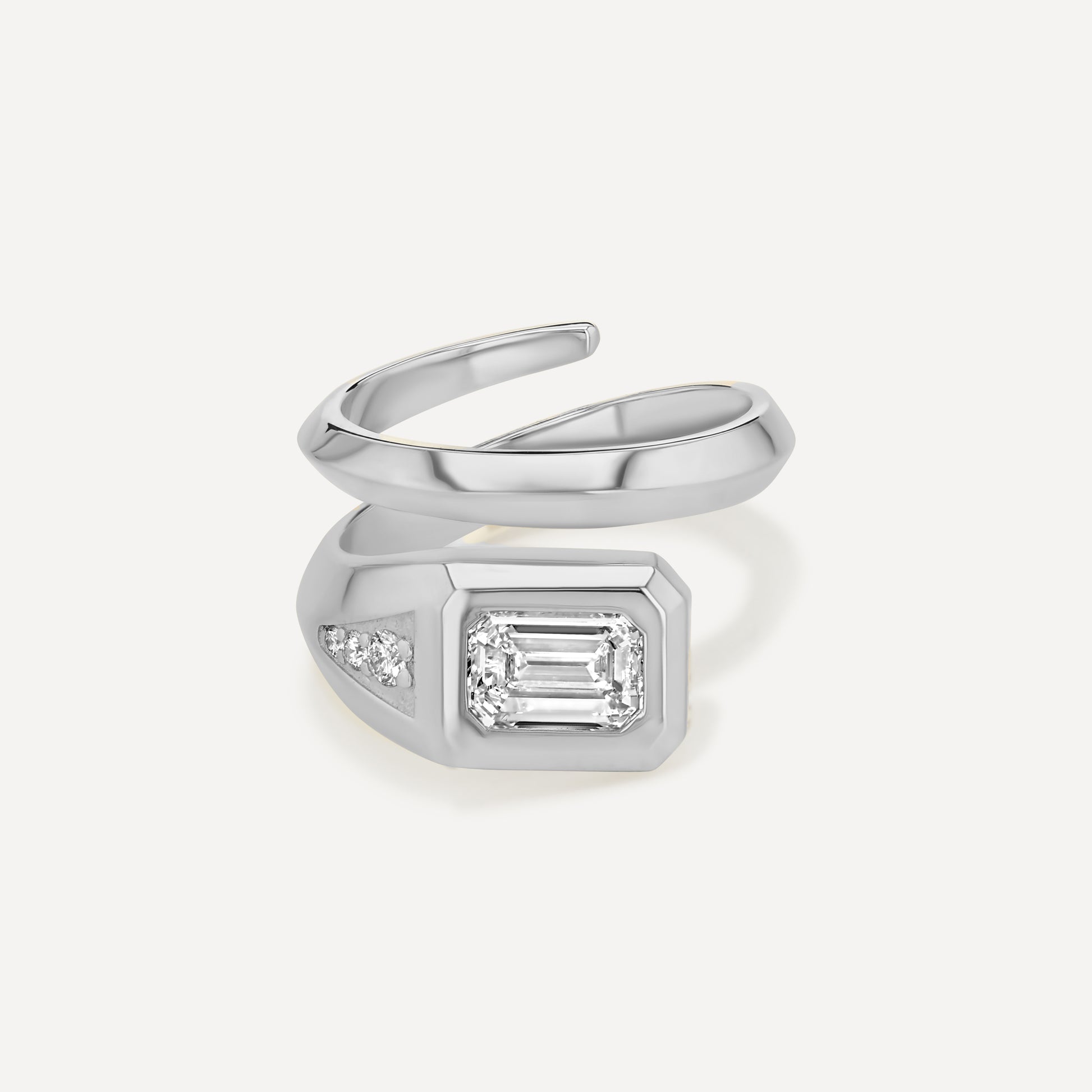 A modern wrap-style silhouette with a refined knife-edge band. The asymmetrical diamond accents create a striking, balanced look that feels both classic and unexpected.
