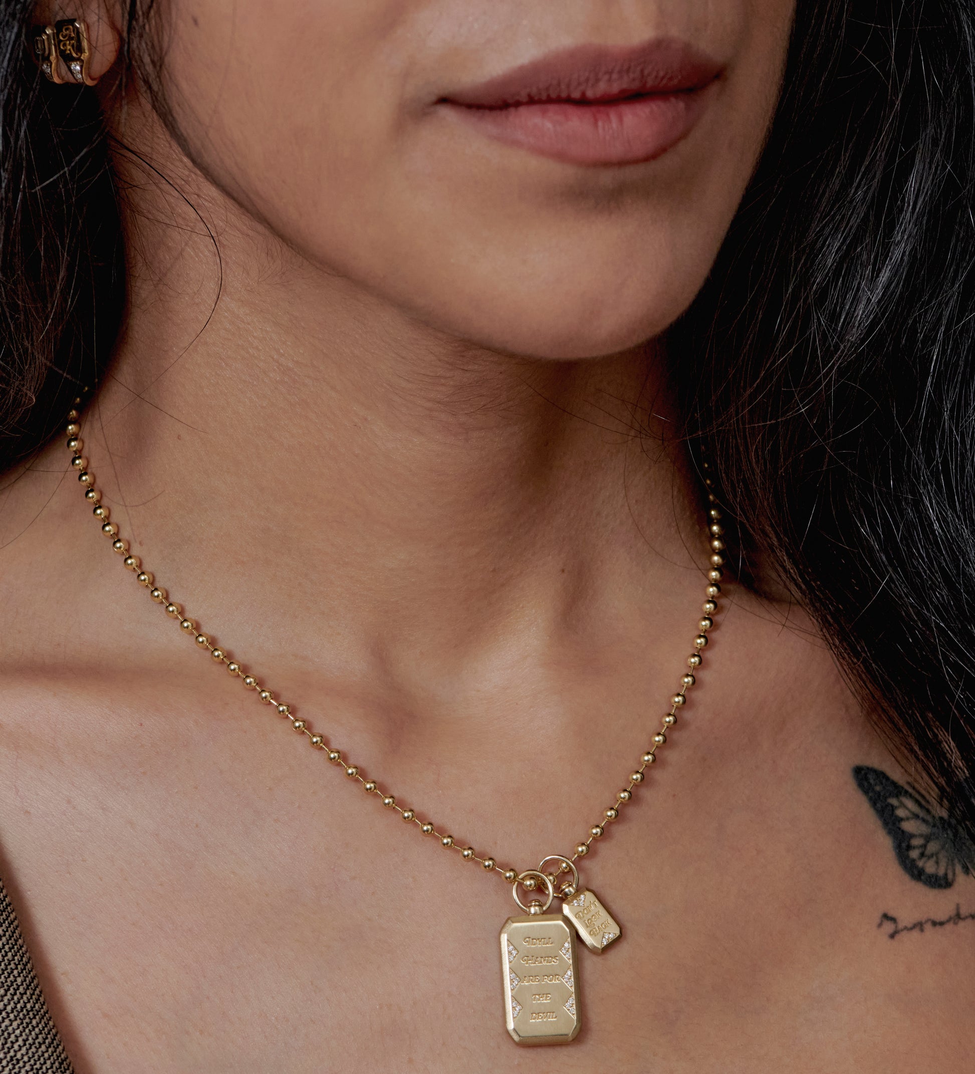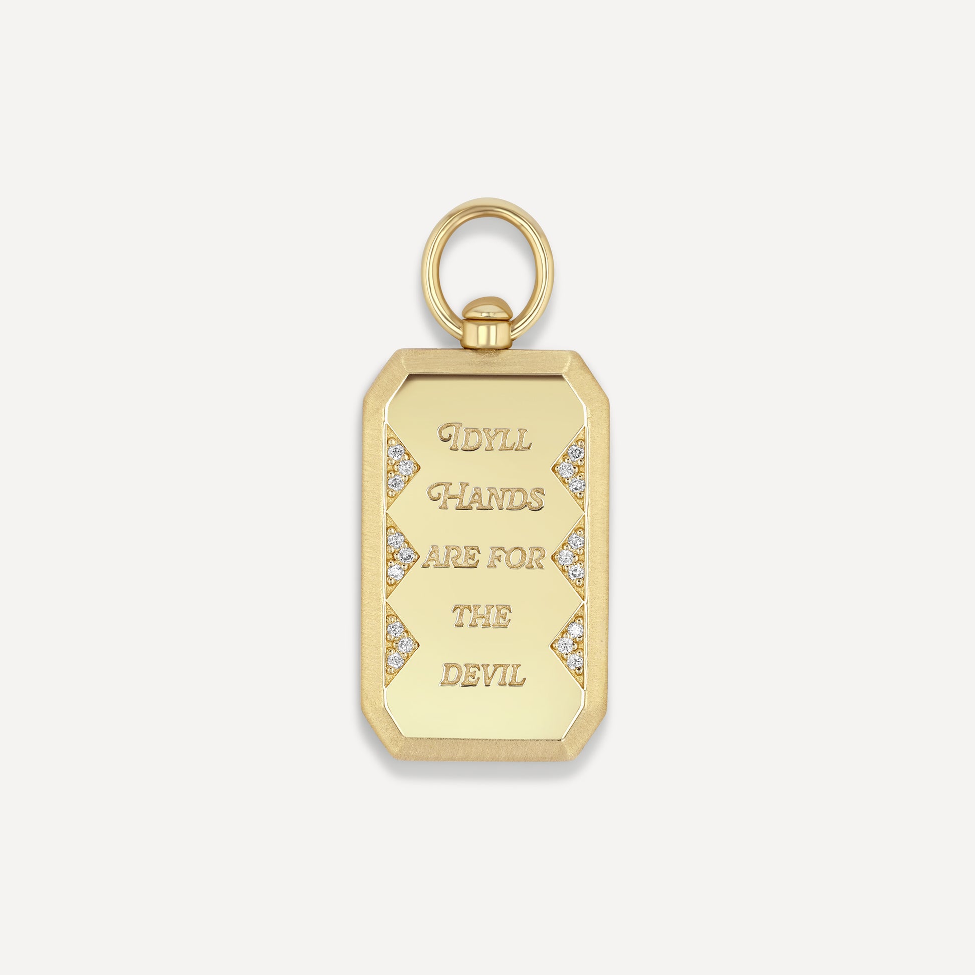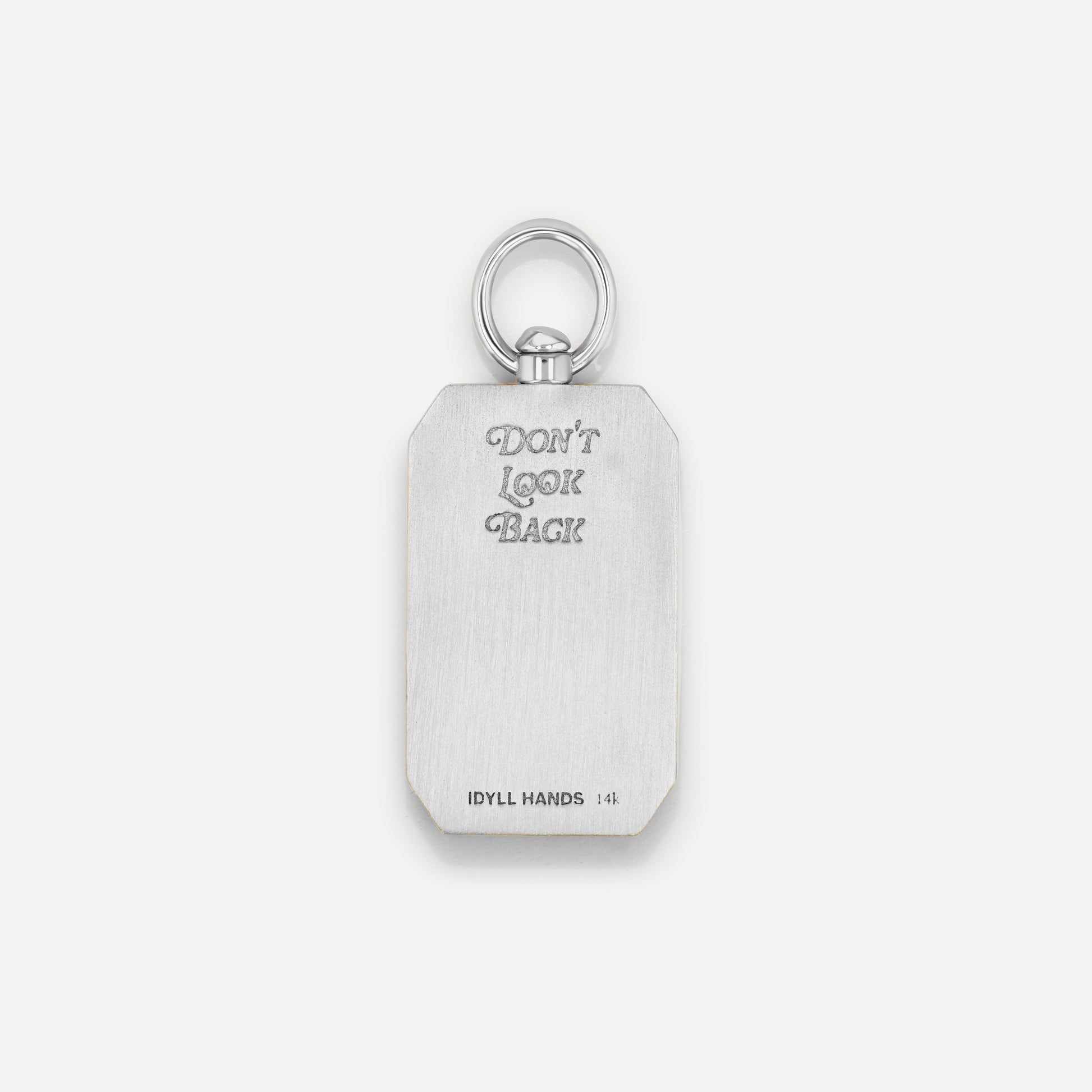 A modern heirloom with a story to tell. The front is engraved with Idyll Hands Are for the Devil and the reverse reads Don’t Look Back, a reminder to keep creating and move forward boldly. Its angular silhouette feels refined yet substantial, while the swivel bail allows the charm to move freely on a strand of pearls, a gold chain, or layered into your personal collection. Total height including bail is 32mm. Weight is 8 grams.