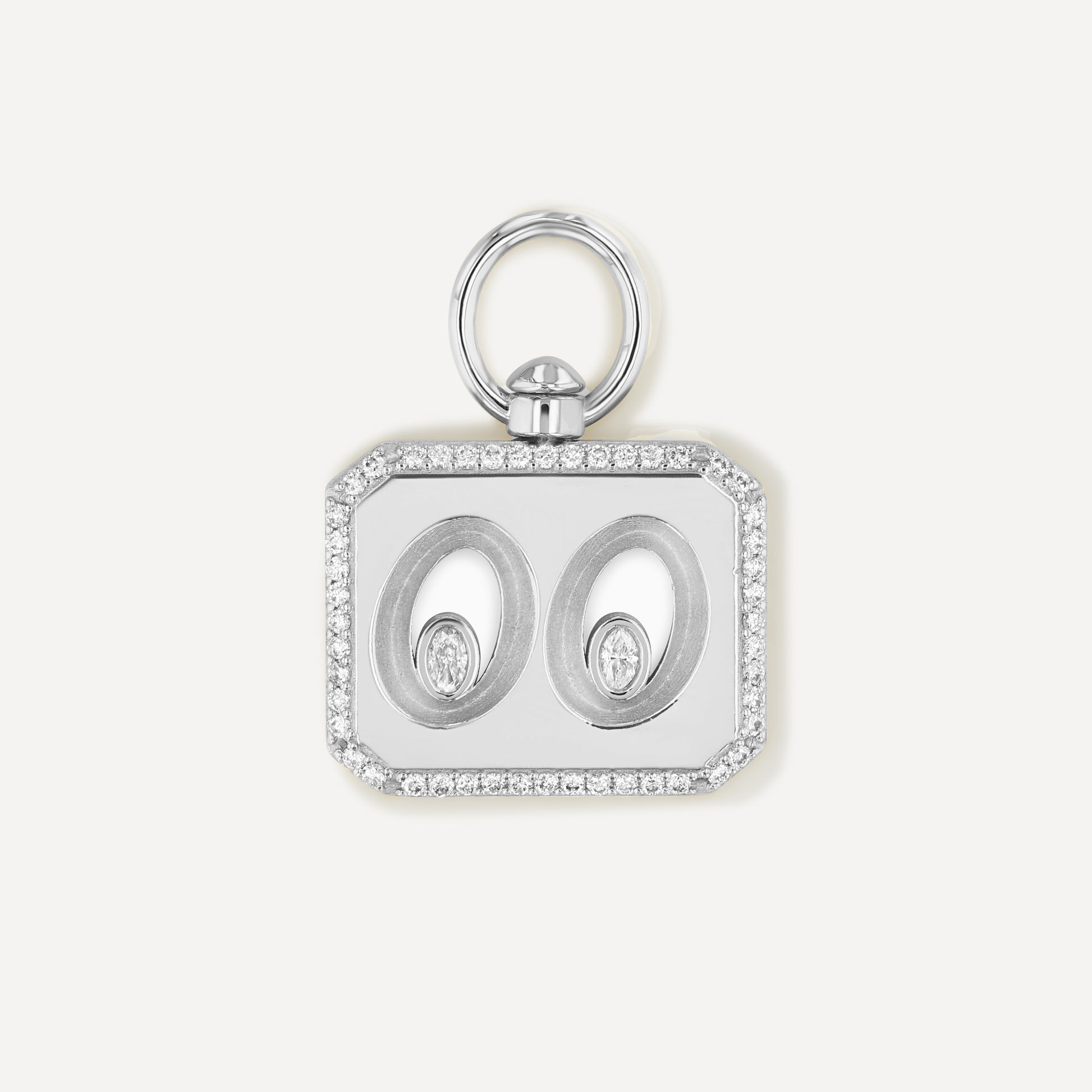 Crafted in solid sterling silver and framed with a halo of natural diamonds (VS clarity, G–H color). At the center, two oval-cut diamonds form bold windows that symbolize perspective, vision, and possibility.