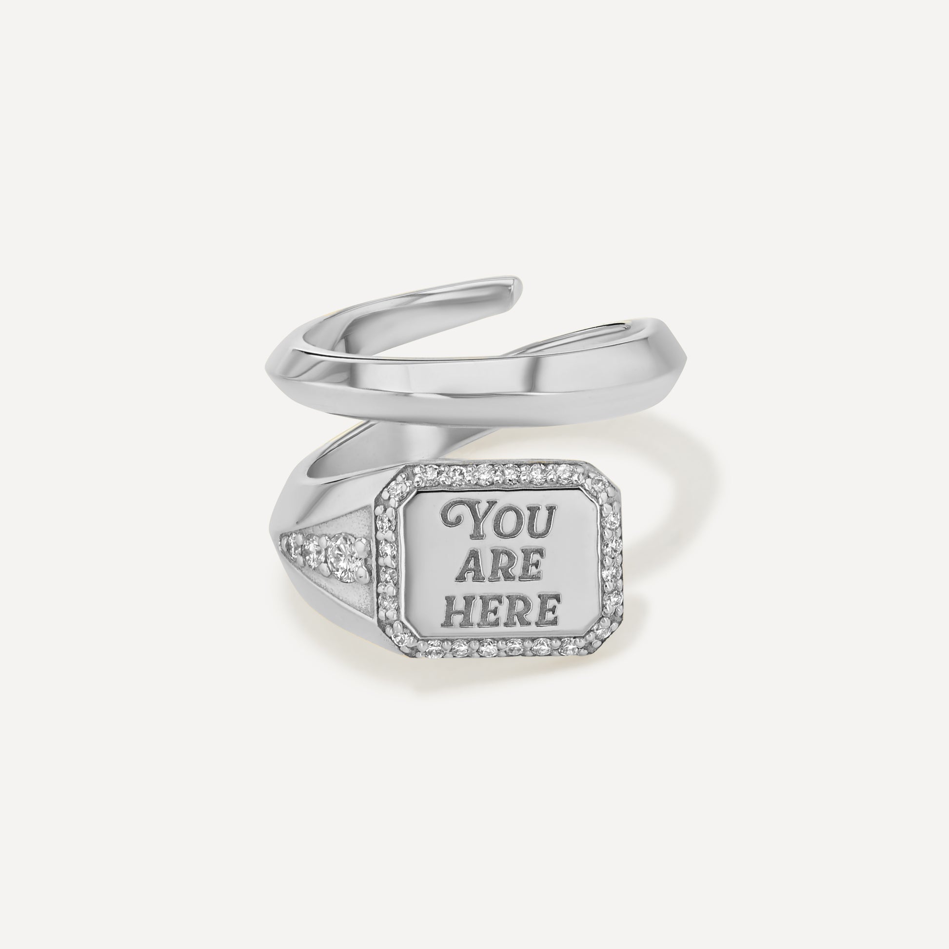 This wrap-style signet ring features a rectangular face engraved with YOU ARE HERE.